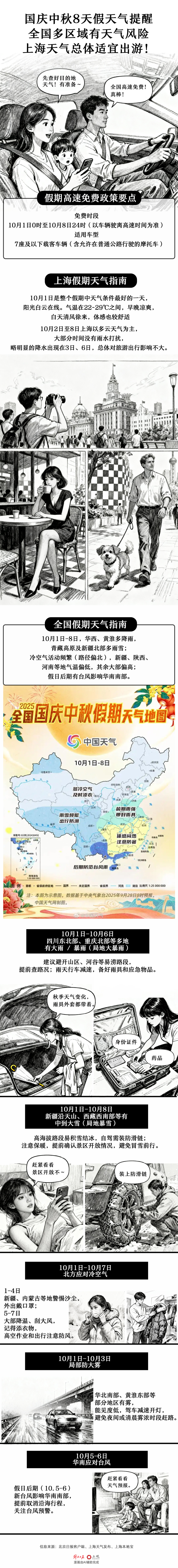 国庆假期开启,10 月 1 日 0 时至 8 日 24 时,7 座及以下载客车辆(含普通公路摩托车)高速免费,以驶离时间为准。全国天气 “画风” 各异,出行需按目的地备好防护装备。上海堪称假期 “天气优等生”,10 月 1 日阳光白云相伴,22~29℃的气温搭配早晚凉爽、日间清风,体感格外舒适;2 日至 8 日以多云为主,仅 3 日、6 日有零星降水,对逛展出游影响甚微。
