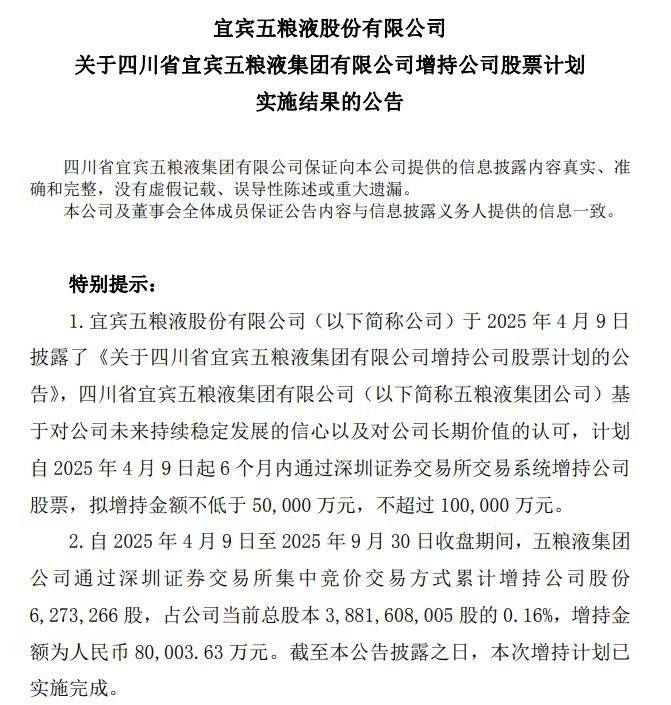 10月10日晚,五粮液(000858)发布公告称,自2025年4月9日至2025年9月30日收盘期间,五粮液集团公司通过深圳证券交易所集中竞价交易方式累计增持公司股份627.33万股,占公司当前总股本38.82亿股的0.16%,增持金额约8亿元。截至公告披露之日,本次增持计划已实施完成。